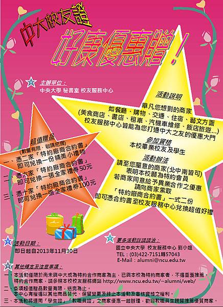 本活動適用於本校畢業校友、學生皆可參加。只要到屬意商家(不限地點,北中南皆可),表明本校願為特約會員,若商家同意給予異業合作之優惠,請向商家索取「特約廠商合約書」一式二份。即可憑「特約廠商合約書」至校友服務中心兌換超值好禮。(參加活動期限:102年10月01日至102年11月30日)